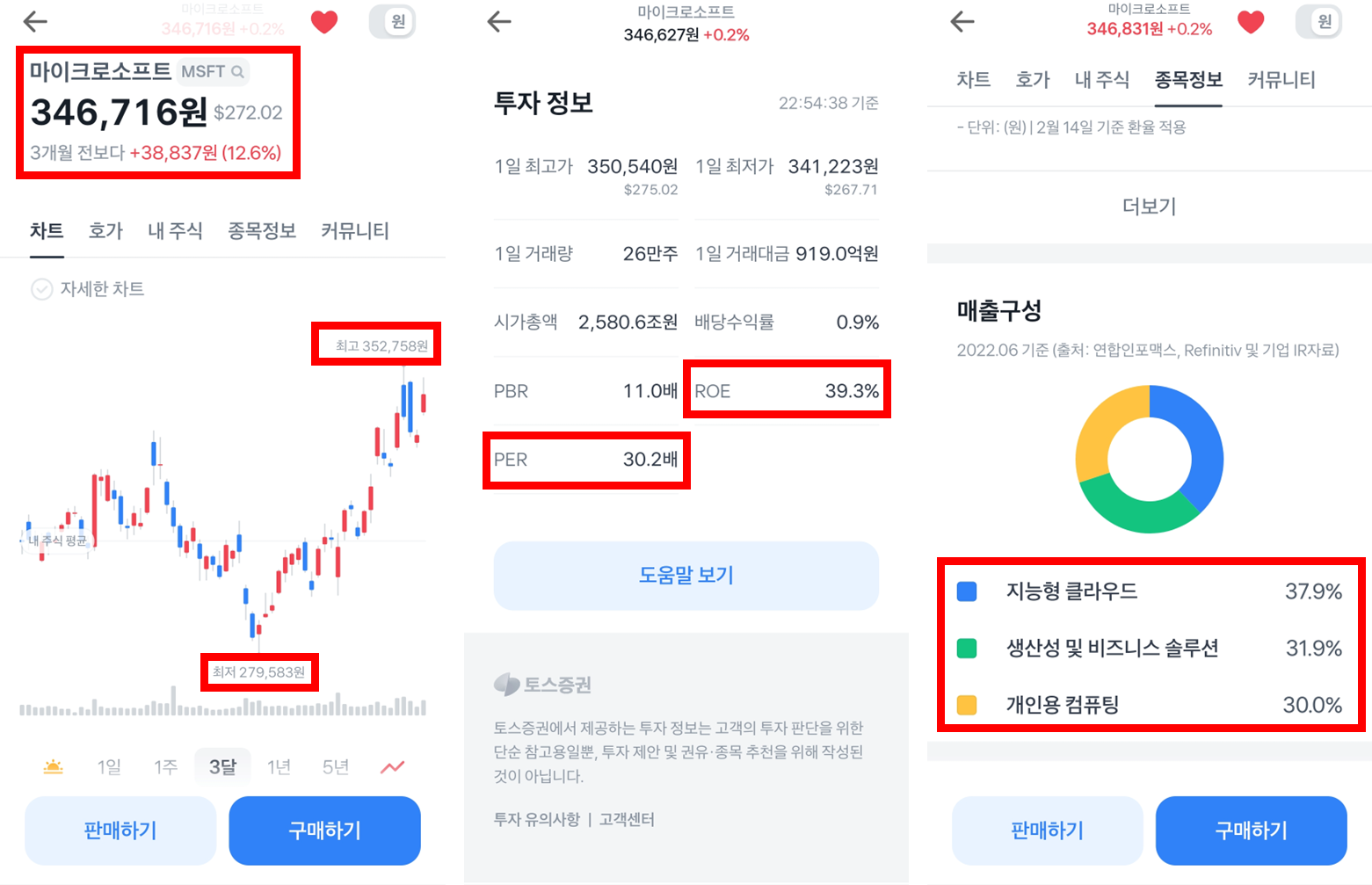매출구성은 지능형 클라우드, 생산성 및 비즈니스 솔루션, 개인용 컴퓨팅가 비슷한 비율로 구성하고 있습니다.