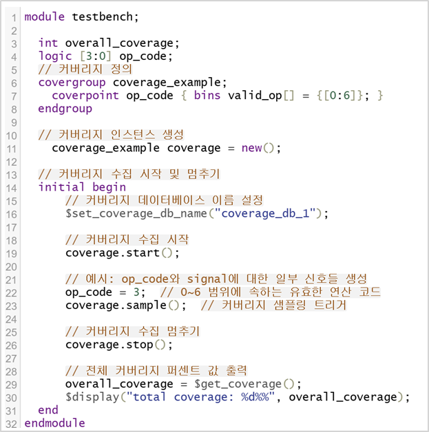 | ignore_bins | 특정 값을 커버리지 추적에서 제외하고 싶을 때 사용. | bins ignore_this[] = {16, 20}; |