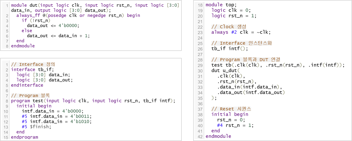 - program 블록은 TB 코드와 RTL 간의 레이스 없이 상호작용을 보장합니다.