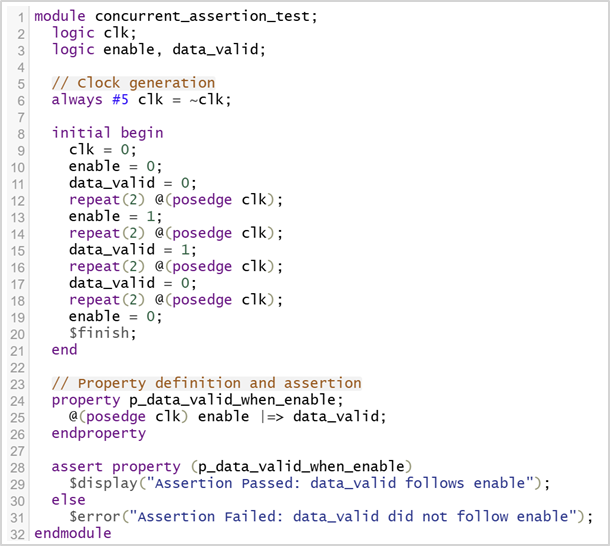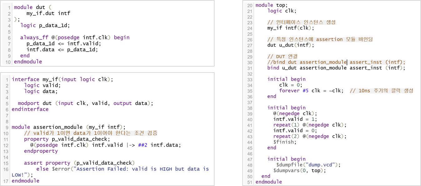 - pass_action에는 $display() 등, fail_action에는 $error()와 같은 메시지 출력이 주로 사용됩니다.