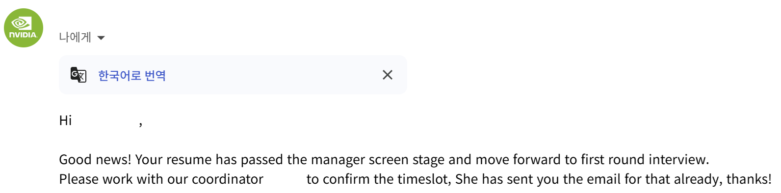 현재 업무에서 기술적인 성장이 힘들어 부서 이동을 고민을 하던 도중 링크드인을 통해 엔비디아 리쿠르터에게 연락을 받았고, 정말 생각지도 못한 기회였기 때문에 이틀 밤을 새서 Resume를 작성하고 지원서를 제출했습니다.