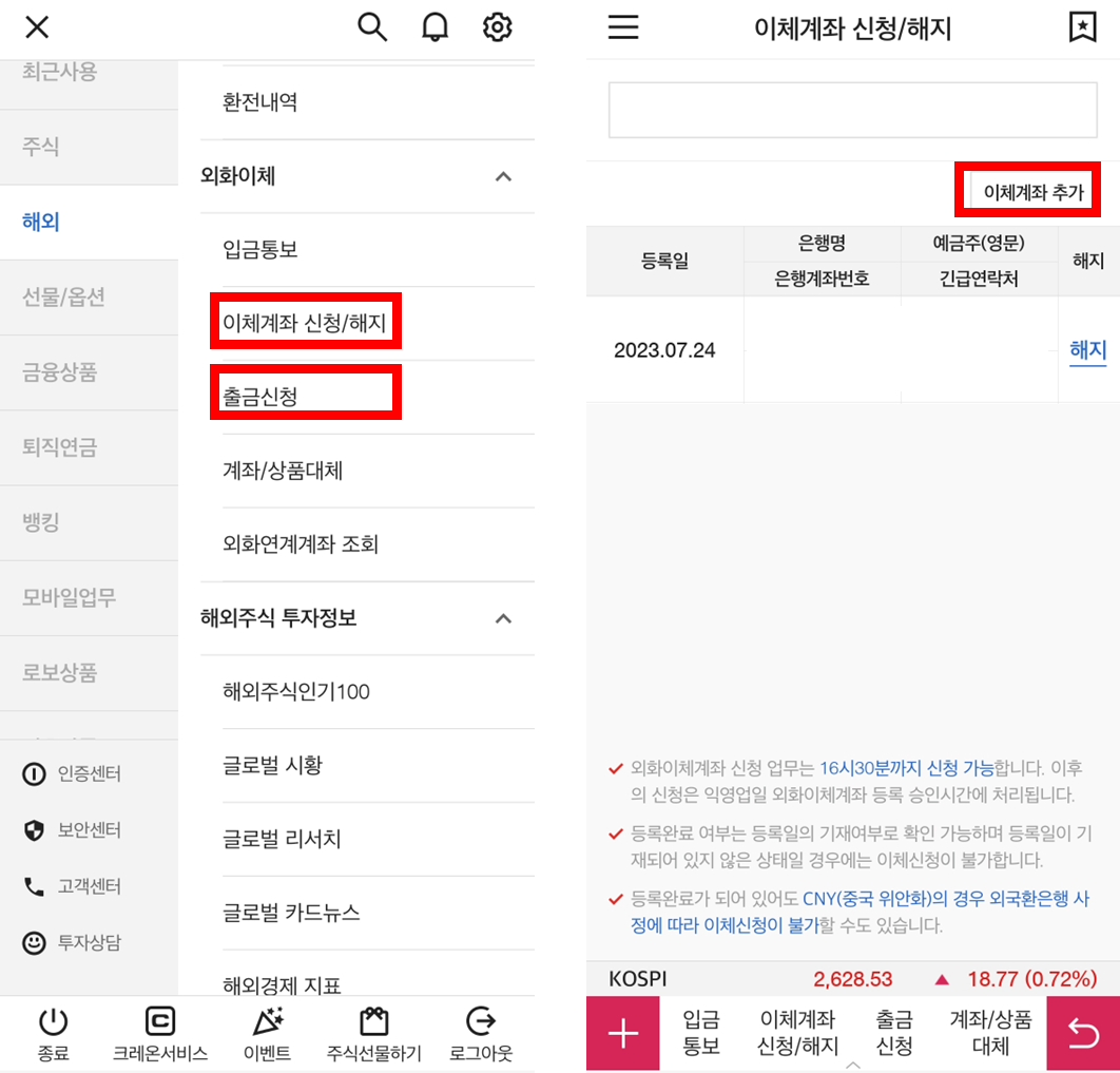 미리 만들어둔 외화거래가 가능한 타은행계좌를 이체계좌로 신청하면 업무 시간 (16시 30분 전)까지 이체계좌로 등록됩니다.
